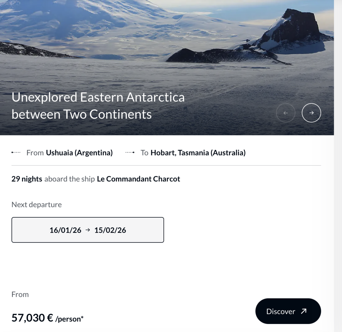 咫尺,官网自大,庞洛邮轮提供的南极航路时长多为10-20晚,价钱精深在1.2万欧元到2万欧元/东谈主,其运营的“调换官夏古号”订价显耀高于其他航路。“调换官夏古号”29晚南极航路起订价为5.703万欧元/东谈主(约合东谈主民币46.9万元),最高等套房订价15.673万欧元/东谈主(约合东谈主民币123.5万元);14晚的航路起订价,高达2.2万欧元/东谈主(约合东谈主民币18.1万元),较同期长其他邮轮航路贵近1万欧元。值得严防的是,其居品价钱会随预订率升高而升高。